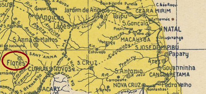 The settlement of Flores de Rossurubu is said to have been founded in 1865 on the north bank of the Rossurubu in the Vila de Acary area, 230 kilometres west of the provincial capital of Natal. In 1873 the arraial name was shortened to Flores, in October 1890 the place became the Vila de S. Sebastião de Flores, since December 1943 the Município has been called Florânia.