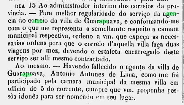 Nova Monteiro writes in Administrações e Agencias Postaes do Brasil Imperio (Brasil Filatelico/RJ, 1934-5; reprint SPP 1994-1999) that there had been a post office there since May 1854. However, this was a new appointment following the death of the previous post office employee, as reported in the regional press: