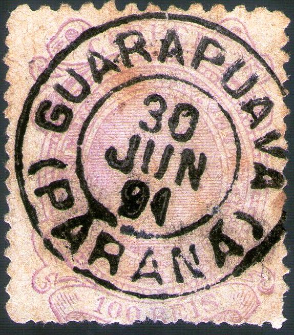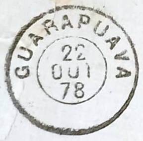 Laut Ministerialbericht (Relatorio do Ministerio do Imperio) von 1856 wurde die Postagentur in Guarapuava jedoch tatsächlich 1854 gegründet, das genaue Datum ist noch unbekannt. Der bisher älteste Poststempel ist der Doppelkreis GPR-0100b (Abb. José L. Fevereiro), den es auch in blau und dunkelviolett gibt:
