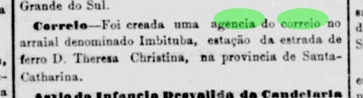 Nach der Entstehung des Postamts in Vila Nova im Mai 1881, wurde im April 1882 auch ein Postamt in Imbituba ins Leben gerufen, wie Luiz. C. Fritzen in Agências Postais da Província de Santa Catharina durante o Império Brasileiro (Boletim da AFSC no. 56, Florianópolis, 2007) schreibt. Dies wird von der Presse in Rio bestätigt: