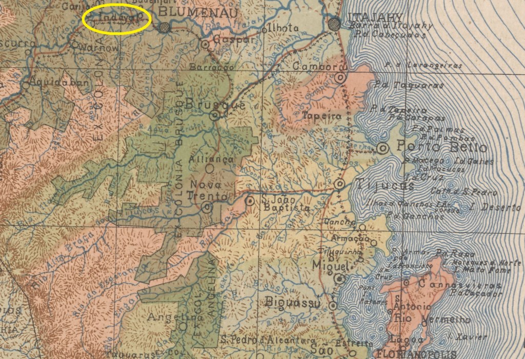 Indayal had been a distrito of the Vila de Blumenau since September 1886 and was located on the south bank of the Itajaí-Açu at the mouth of the Benedito, 170 kilometres northwest of the provincial capital Desterro (today: Florianópolis). The town was elevated to the status of a vila in October 1893, but lost this status again four years later. Indaial (as it is spelt today) only became a município again in February 1934. The name comes from the Tupi-Guarani language and means ‘many palm trees’.