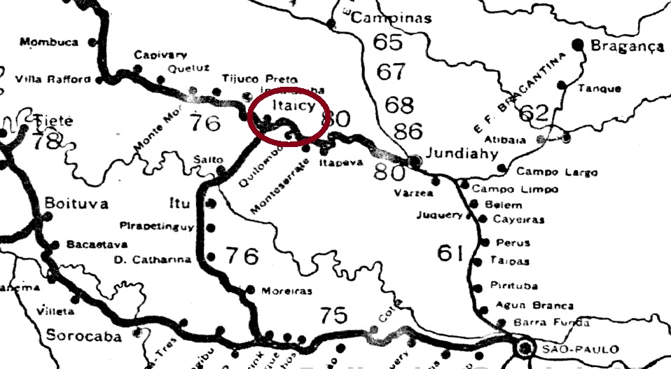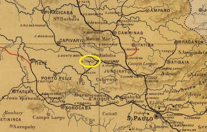 Itaicy station was opened in 1873 by the E.F. Ytuana railway company (Campinas branch line) and is located on the north bank of the Jundiaí in the Município Indaiatuba, 100 km north-west of the provincial capital of São Paulo. In the Tupi-Guarani language, Itaici means spring by the water. The railway line went to the Cia. União Sorocabana e Ytuana in 1892, to the Sorocabana Railway in 1907, to the E.F. Sorocabana in 1919 and belonged to FEPASA (estacoesferroviarias.com.br) from 1971 until it was shut down around 1988. Today, the tracks have disappeared and the station building has served as a cultural centre for the municipality of Indaiatuba since 2022.