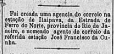 Der Bahnhof Itaipava wurde im Februar 1886 von der Eisenbahngesellschaft E.F. do Norte (ehemals Príncipe do Grão-Pará) eröffnet und lag im Município de Petrópolis, über 80 km nördlich der Hauptstadt Rio de Janeiro. Die Strecke wurde 1888 von der R.J. Northern Railway übernommen und gehörte von ca. 1890 bis zu ihrer Stilllegung 1964 der E.F. Leopoldina. Heute sind die Gleise verschwunden, auf dem ehemaligen Bahnhofsgelände befindet sich ein Einkaufszentrum.