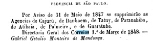Nova Monteiro schreibt in Administrações e Agencias Postaes do Brasil Imperio (Brasil Filatelico/RJ, 1934-5; Nachdruck SPP 1994-1999) über eine Wiedereröffnung der Agentur im Februar 1849, die gut zehn Jahre später wieder geschlossen wurde: