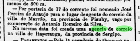 Nova Monteiro schreibt in Administrações e Agencias Postaes do Brasil Imperio (Brasil Filatelico/RJ, 1934-5; Reprint SPP 1994-1999), dass das örtliche Postamt im Juli 1864 eröffnet wurde. Allerdings wurde bereits im Vormonat in der Presse von Rio über die Einrichtung einer Postagentur in Itaporanga berichtet: