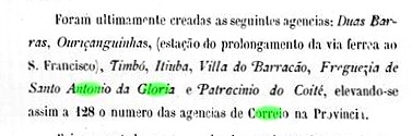 R. Koester schreibt in Carimbologia XXIV, dass es dort seit März 1887 ein Postamt gab. Dies wird durch den Bericht des Präsidenten der Provinz bestätigt: