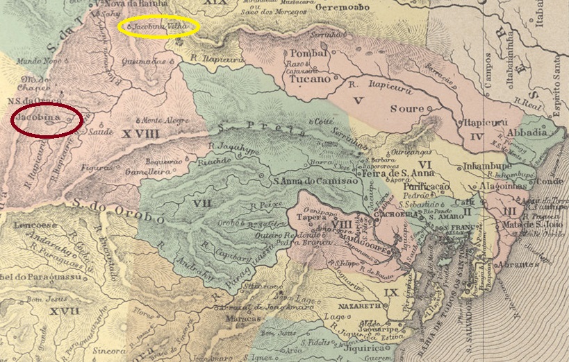Founded in 1677, the Freguesia de Sto. Antonio da Jacobina was originally located in N. Sra. das Neves do Say, today Município de Senhor do Bonfim, 390 km north-west of the colonial capital Salvador da Bahia (yellow oval in the map above). It was elevated to a Vila in August 1720 and in February 1724 moved approx. 100 km south to the north bank of the Itapicuru-Mirim, where the village of Bom Jesus da Glória was located (red oval in the map above). Jacobina has been a town since July 1880.