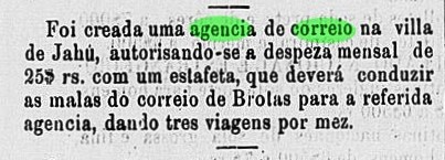 Wie die Presse von São Paulo berichtet, wurde im Dezember 1867 beschlossen, in der Vila ein Postamt einzurichten: