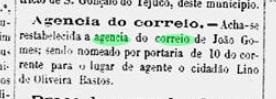 Nova Monteiro schreibt in Administrações e Agencias Postaes do Brasil Imperio (Brasil Filatelico/RJ, 1934-5; Reprint SPP 1994-1999), dass es in João Gomes seit Mai 1863 ein Postamt gab. Da die Presse von Minas Gerais von einer Wiedereröffnung im April 1872 berichtete, muss es vorher geschlossen worden sein.