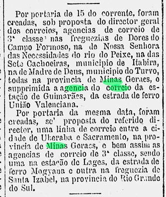 Der Philatelist Mário Celso Orsi Jr. schreibt dazu das Datum Januar 1886, was ein Abschreibfehler sein dürfte. Das Bahnhofspostamt wurde im Oktober 1898 geschlossen, wie aus der regionalen Presse hervorgeht: