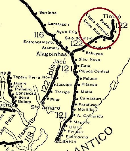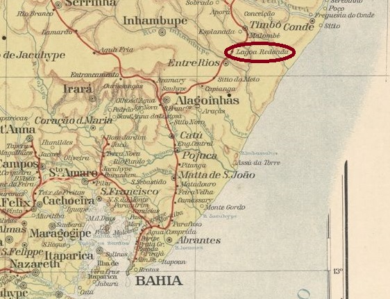Der Bahnhof Lagoa Redonda (Runder See) wurde im März 1887 von der Eisenbahngesellschaft E.F. Bahia ao São Francisco, Zweig Timbó, eröffnet und lag nahe dem Südufer des Inhambupe im Município de Entre Rios, 160 km nördlich der Provinzhauptstadt Salvador da Bahia. Die Strecke ging 1911 an die Chemins de Fer Fédéraux de l’Est Brésilien, 1935 an die V.F.F. Leste Brasileiro und gehörte von 1975 bis zu ihrer Stilllegung 1996 der Rede Ferroviária Federal S.A. (estacoesferroviarias.com.br). Heute sind die Gleise noch vorhanden, das Bahnhofsgebäude ist eine Ruine.