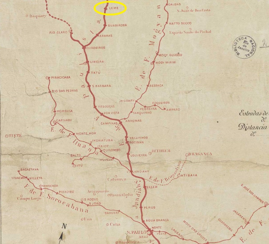 Der Bahnhof Leme wurde im September 1877 von der Companhia Paulista de Estradas de Ferro (Descalvado-Zweig) eröffnet und lag im Município de Pirassununga, 190 km nördlich der Provinzhauptstadt São Paulo. Die Strecke gehörte von 1971 bis zu ihrer Stilllegung 1997 dem Konsortium FEPASA (estacoesferroviarias.com.br). Heute sind die Gleise verschwunden, das Bahnhofsgebäude dient der Gemeinde als Kulturzentrum.