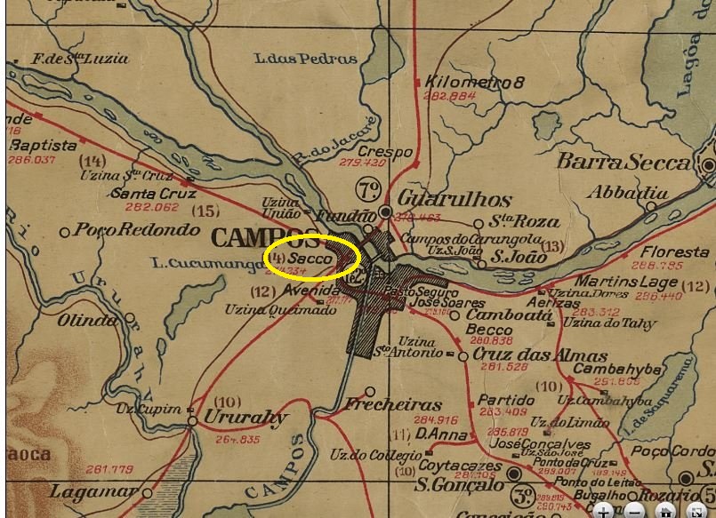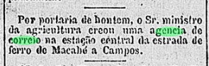 Der Zentralbahnhof der Eisenbahngesellschaft Estrada de Ferro Macahe e Campos wurde im Juli 1875 eröffnet. Er lag nicht im heutigen Macaé, sondern im Stadtgebiet von Campos dos Goytacazes, 280 Kilometer nordöstlich der Hauptstadt Rio de Janeiro. Die Bahnlinie ging 1887 in den Besitz der E. F. Leopoldina über und gehörte von 1975 bis zur Stilllegung im Jahr 1996 zur Rede Ferroviária Federal S. A. (estacoesferroviarias.com.br). Heute sind die Gleise noch vorhanden und das Gebäude wird als Eisenbahnmuseum genutzt.