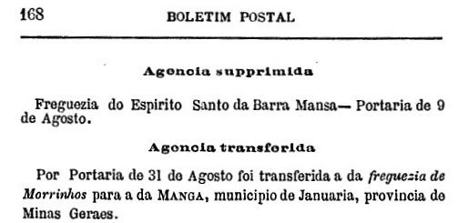 Two dates have been found for the creation of the local post office. One is April 1885, as written by Paula Sobrinho (História Postal de Minas Gerais, Belo Horizonte, 1997) and R. Koester (Carimbologia XXVII). The second date is August 1889, when the post office was moved from Morrinhos to Manga, as reported in the Post Bulletin (Boletim Postal).