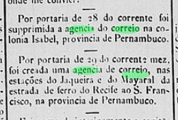 Aus dem Verzeichnis der kaiserlichen Postämter (Tabella das Agencias do Correio do Imperio, Rio de Janeiro, 1885) geht hervor, dass es dort seit 1884 ein Bahnhofspostamt gab. Die Presse von Rio de Janeiro berichtet darüber im Mai dieses Jahres: