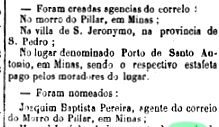 Nova Monteiro schreibt in „Administrações e Agencias Postaes do Brasil Imperio” (Brasil Filatelico/RJ, 1934–1935; Nachdruck SPP 1994–1999), dass es dort seit September 1862 ein Postamt gab. Der erste Postagent wurde im gleichen Monat von der Presse in Rio vorgestellt.