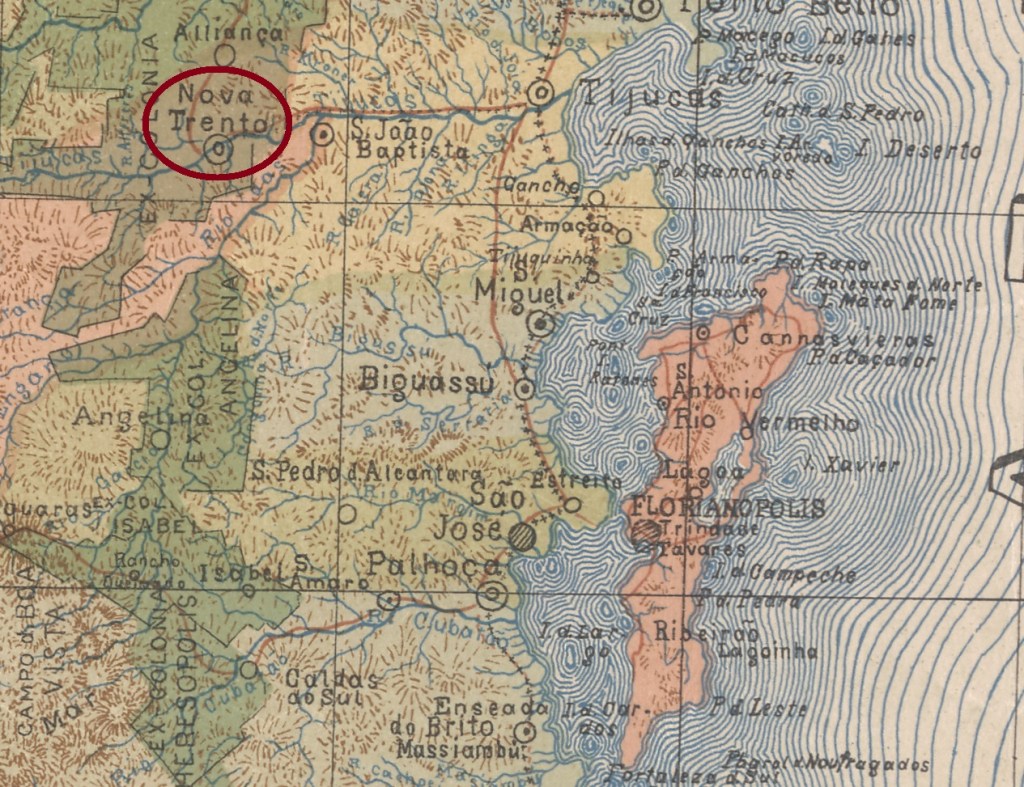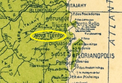 The Freguesia de Nova Trento, settled by Italian colonists, had existed since April 1884. It belonged to the Vila de Tijucas, was located on the north bank of the Rio do Braço and was 90 km northwest of the provincial capital Desterro (today Florianópolis). Nova Trento has been an independent municipality since August 1892.