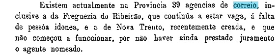 R. Koester schreibt in Carimbologia XXVIII, dass im Februar 1887 die Einrichtung eines Postamts vor Ort beschlossen wurde. Allerdings war dieses im Oktober immer noch nicht in Betrieb, wie aus dem Bericht des Provinzpräsidenten hervorgeht.