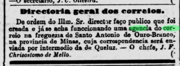 Two different dates have been found for the establishment of the local post office. One is January 1860, as Paula Sobrinho writes in ‘História Postal de Minas Gerais’ (Belo Horizonte, 1997), which is confirmed in the postal report (Relatorio Postal) for 1886. The second is January 1868, as reported in the Rio press: