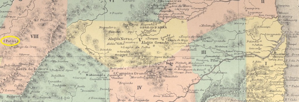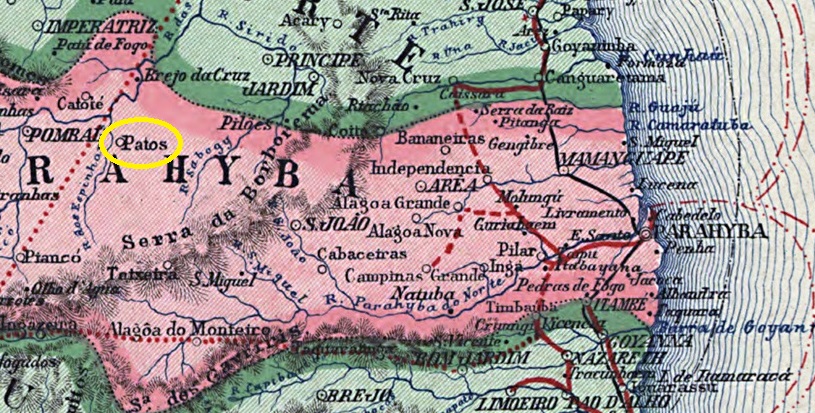 The Freguesia de N. Sra. da Guia de Patos had been in existence since 1788. It belonged to the Vila de Pombal and was located on the west bank of the Rio Espinharas, 300 kilometres west of the later provincial capital Parahyba (today João Pessoa). Patos became a vila in December 1832 and a city in March 1903.