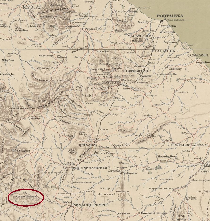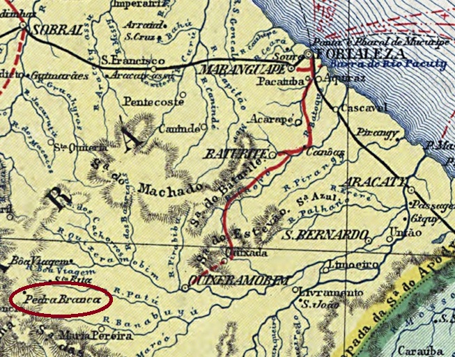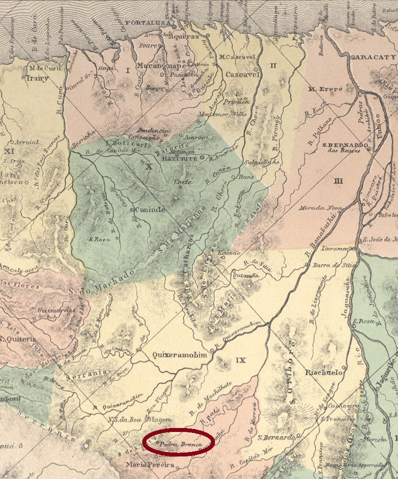 Pedra Branca (White Stone) had been a district of Vila de Maria Pereira since October 1854 and was situated 260 kilometres south of the provincial capital, Fortaleza. In August 1873, Pedra Branca became the Freguesia de S. Sebastião da Pedra Branca, which was elevated to the status of a Vila eight years later and finally became a town in September 1920.