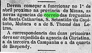 Paula Sobrinho writes in História Postal de Minas Gerais (Belo Horizonte, 1997) that the local post office was created in October 1877. However, it did not start operating until April of the following year, as noticed by the Rio press: