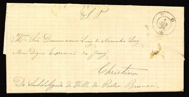At the beginning of the republic, the postmarks bore the place name ‘S. Sebast. da Pedra Branca’ (see SMG-2595).