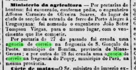 Conforme consta da imprensa do Rio, a criação de uma agência postal local foi decidida em setembro de 1887: