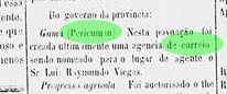 Laut Nova Monteiros Administrações e Agencias Postaes do Brasil Imperio (Brasil Filatelico/RJ, 1934–1935; Nachdruck SPP 1994–1999) gab es dort seit Februar 1860 ein Postamt. Ein späteres Datum, April 1881, meldete der Postbericht (Relatorio Postal) von 1886, was durch die regionale Presse bestätigt wurde: