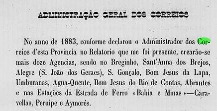 Köstner writes in ‘Carimbologia XXX’ that there had been a post office at the station since July 1875. However, this date is unlikely, as the railway line was not built until between 1881 and 1882. In the directory of imperial post offices (Tabela das Agências do Correio do Império, Rio de Janeiro, 1885), however, the year 1883 is given, which is confirmed by a report from the Provisional Government Council of the province the following year: