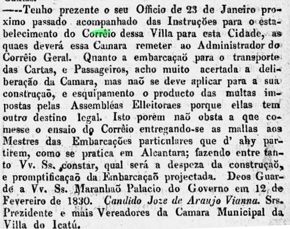 Für die Gründung des örtlichen Postamtes wurden zwei Daten gefunden. Nova Monteiro (Administrações e Agencias Postaes do Brasil Imperio, in Brasil Filatelico/RJ, 1934-5; Reprint SPP) gibt den März 1830 an, was von der regionalen Presse bestätigt wird:
