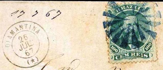 Diamantina produced an astonishing number of mute cancellations in the imperial period. No less than 54 were counted in Mute Cancellations of the Brazil Empire / Carimbos Mudos do Brasil Império (Brazil Philatelic Association, Rio de Janeiro, 2000), by James Dingler and Klerman W. Lopes: