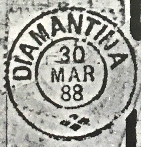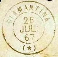 Until about 1836 the postmarks still had the place name Tejuco (see TMG-3740). The first postmark with Diamantina is VMG-3745a which has the no. 1524 under Paulo Ayres (Catálogo de Carimbos Brasil-Império, S. Paulo, 1937, 1942) and is listed in the RHM catalogue under P-MG-26: