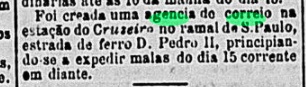 Nova Monteiro writes in Administrações e Agencias Postaes do Brasil Imperio (Brasil Filatelico/RJ, 1934-5; reprint SPP 1994-1999) that there had been a post office there since October 1858. This date is confirmed by the postal report (Relatório Postal) for 1887. The only imperial postmark to date is CPB-0125b (fig. Jorge L. Pedreira):