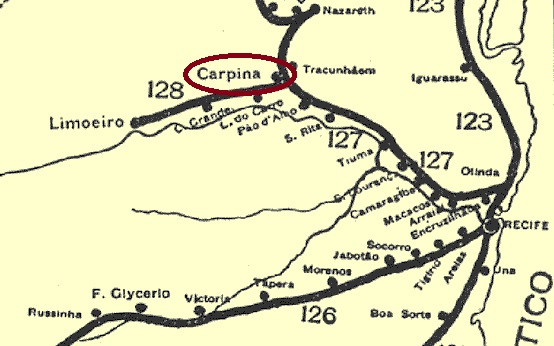 Das Gebiet um den Bahnhof wurde im Dezember 1901 zum Bezirk Floresta dos Leões (Löwenwald), ein Name, den später auch der Bahnhof erhielt. Im Juli 1909 wurde Floresta dos Leões ein eigenständiger Município, das seit Dezember 1938 Carpina heißt. Carpina war auch der ursprüngliche Landbesitzer des Ortes, der auf einem Hügel (chã) lebte.