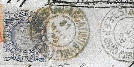 Da noch kein Bahnhofspoststempel zu sehen ist, wurde vermutlich der Wagenstempel (Correio Ambulante) verwendet. Zuerst erschien CSP-0330a (Samml. José A. Junges) mit Daten von 1885 bis 1888: