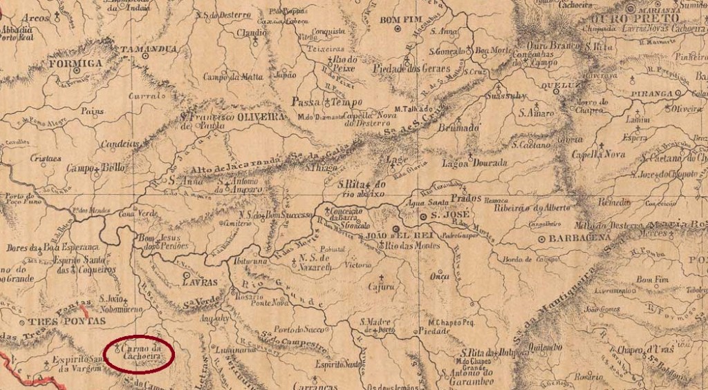 The old chapel of Carmo de Cacunda was located in the area of Vila de Itabira on the west bank of the Tanque River, 150 km north of the provincial capital Ouro Preto. It became the district of N. Sra. do Carmo in 1846 and a freguesia in September 1870. Since December 1938, the place has borne the name Senhora do Carmo.