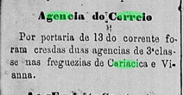 The second establishment of the postal agency must have taken place before 1854, as shown in the 1859 report of the Imperial Ministry. Since the post office is still mentioned in an official bulletin in July 1861, it must have been closed later. The third period of operation probably began in 1866, as shown in the Directory of Imperial Post Offices (Tabella das Agencias do Correio do Imperio, Rio de Janeiro, 1885).