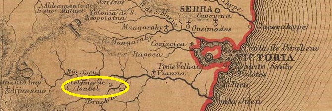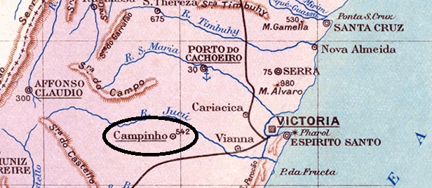 Campinhoberg (Campinho Mountain) was a colony of German Protestants from about 1860, belonging to the freguesia of Santa Izabel in the município Viana, located on the west bank of the river Jucu (North Branch), almost 50 km northwest of the provincial capital Vitória. The place was declared a district in December, when Santa Izabel became a município, and four years later it became a município itself, called Domingos Martins. The name commemorates Domingos José Martins (1781-1817), who was born in Espirito Santo and executed after the failed Pernambuco Revolution.