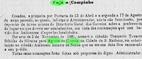 According to the Directory of Imperial Post Offices (Tabella das Agencias do Correio do Imperio, Rio de Janeiro, 1885), there had been a post office there since 1873, but it was closed in February 1917, as Paulo Novaes reports in agenciaspostais.com.br. R. Koester has shown three imperial postmarks of this agency in Carimbologia VIII: