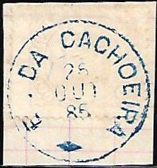 A not quite mute cancellation from Cachoeira was in use from about 1882 until after 1888 and is listed both in P. Ayres (op. cit.) with no. 1047 and in Mute Cancellations of the Brazil Empire / Carimbos Mudos do Brasil Império, (Brazil Philatelic Association, Rio de Janeiro, 2000) by James Dingler and Klerman W. Lopes with no. 4485: