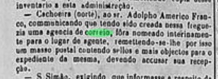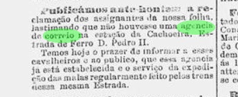 Two post agency creations were found for Cachoeira. Since both are in temporal proximity to the respective railway connections, there is probably a connection. The first was in August 1875, when it was decided to create a post office at the railway station, as reported in the Rio press: