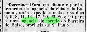 Im Postbericht (Relatorio Postal) für 1887 heißt es, es gab dort ein Postamt seit Oktober 1885. Das ist ein Druckfehler, denn die Regionalpresse meldete als Entstehungstermin der Postagentur genau ein Jahr später: