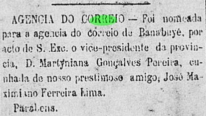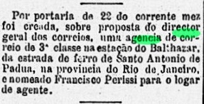 Wie Paula Sobrinho in História Postal de Minas Gerais (Belo Horizonte, 1997) schreibt, gab es am Bahnhof ein Postamt seit Dezember 1885. Der erste kaiserliche Poststempel ist inzwischen BMG-0215a (Abb. Felzmann Auctions):