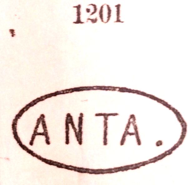It was followed by APR-0010b (fig. from the internet), which was also found in blue and violet for the period 1877-1896, although Koester (op.cit.) suspects that another postmark was in circulation there in between. It is a simple double circle with the inscription ANTONINA at the top.