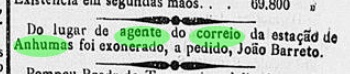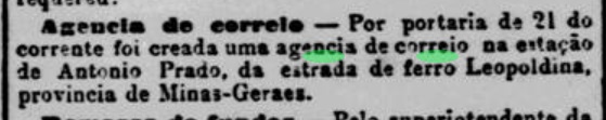Ein Bahnhofspostamt gab es seit Juni 1886, wie Paula Sobrinho in História Postal de Minas Gerais (Belo Horizonte, 1997) schreibt. Das wird durch die Presse aus Rio bestätigt: