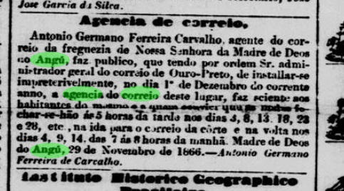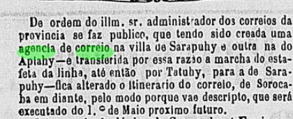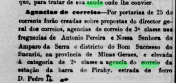Two dates of origin were found for the local post office. First on 5 April 1860, as Paula Sobrinho writes in História Postal de Minas Gerais (Belo Horizonte, 1997). This could be a transcription error, because the second date is exactly 6 years later, on 5 April 1866, as several sources report. However, the agency did not start operations until December of that year, as a note from the Rio press reveals: