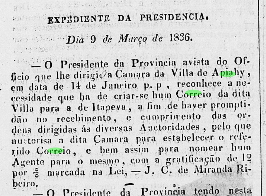Drei Daten für die Entstehung des örtlichen Postamts liegen vor, wobei die ersten beiden verdächtig nahe aneinander liegen. Erstmals im Juli 1832, wie der Philatelist Mario Celso Orsi Jr. schreibt. Da Nova Monteiro in Administrações e Agencias Postaes do Brasil Imperio (Brasil Filatelico/RJ, 1934-5; Reprint SPP 1994-1999) dafür den September 1832 angibt, könnte letztes das Datum der Inbetriebnahme der Agentur sein. Da das Postamt im kaiserichen Postführer (Guia Postal do Imperio, Rio de Janeiro, 1880) aufgelistet wurde und ein weiteres Gründungsdatum aus dem Jahr 1881 im Verzeichnis der kaiserlichen Postämter (Tabella das Agencias do Correio do Imperio, Rio de Janeiro, 1885) vorliegt, könnte es um 1879-1880 geschlossen gewesen sein.