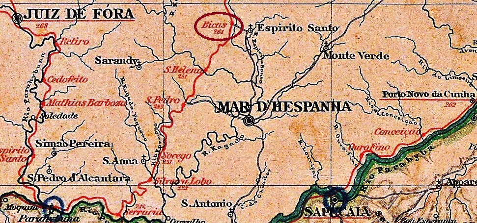 Das schöne portugiesische Wort Bica bedeutet eine natürliche Wasserstelle, die den Durst von Mensch und Tier stillt. Der Bahnhof Bicas wurde im September 1879 durch die Bahngesellschaft Cia. União Mineira (Hauptlinie) eingeweiht und lag im Município von Mar d’Hespanha, 260 km südlich der Provinzhauptstadt Ouro Preto entfernt. 1884 ging die Bahnlinie zur E.F. Leopoldina und gehörte von 1975 bis zur Stilllegung 1996 der Rede Ferroviaria Federal S.A. (estacoesferroviarias.com.br). Heute sind zwar die Schienen weg, das alte Bahnhofsgebäude wurde restauriert und dient als Busbahnhof.