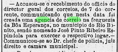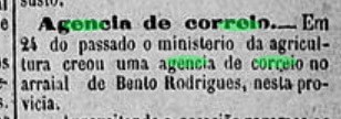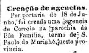 Wie aus dem Nachrichtenblatt der Post in der Provinz Minas Gerais hervorgeht, wurde im Juni 1887 über die Einrichtung eines Postamts vor Ort entschieden: